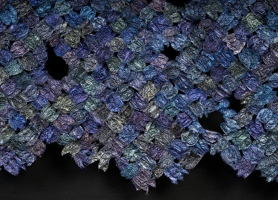 The textile works, formed from artist dyed wild silk cocoons, suggest veils that both reveal and conceal, echoing the layered realities of quantum science, and the screening of the night sky as day is revealed. Drawing on Eastern philosophies and the symbolic cloths of religious traditions, the textiles mark thresholds between the material and spiritual, the known and the unseen.